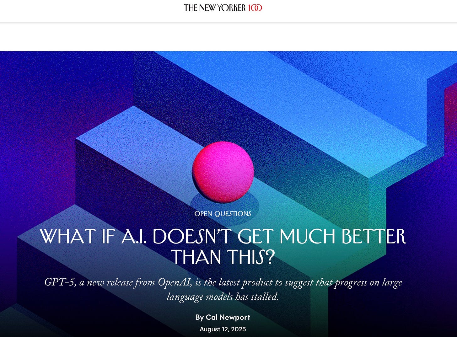 Note : Après de longues vacances, je reprends les publications doucement, un plus grand projet d’article accaparant l’essentiel de mon temps. D’autres posts de plus longue haleine sortiront dans les semaines à venir. L’article ci-dessous est un résumé des analyses les plus pertinentes que j’ai pu lire sur la sortie de ChatGPT-5 et l’évolution récente de la “bulle IA”. Merci de votre fidélité et de votre soutien !