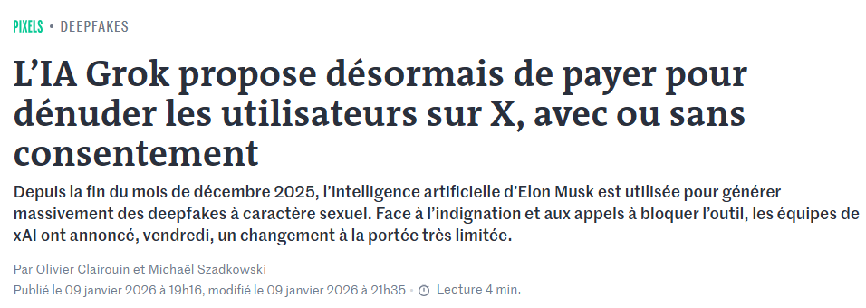 Il s’agit d’un test lourd de conséquences. Si Musk parvient à tirer profit de la situation malgré tout, plus rien ne sera impossible aux Big Tech. Car Grok n’est que le sommet de l’iceberg. Le révélateur d’un problème plus fondamental, ancré au cœur de la Tech : sa capacité à imposer ses choix et lubies à la société, en dehors de tout contrôle démocratique, sans subir la moindre conséquence pour les innombrables dégâts causés.