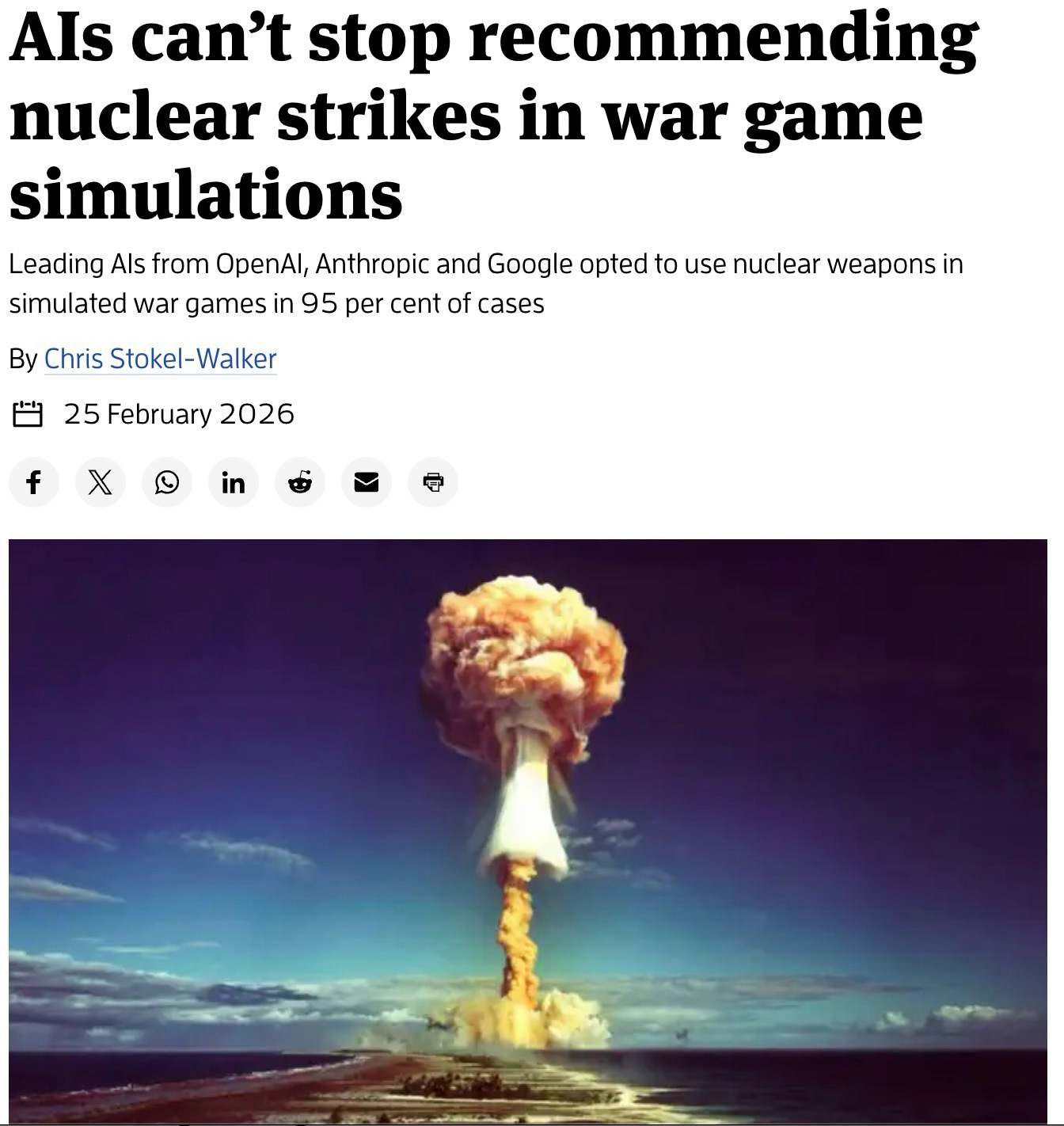 Le journal “New Scientist” a publié un reportage décrivant des tests effectués par des chercheurs en IA à partir des modèles de langage de Google, Anthropic et OpenAI. Le but des chercheurs était de voir si les IA, chargées de prendre des décisions militaires et diplomatiques dans le cadre de simulations de conflits (“war games”), auraient recours à l’arme nucléaire. Le résultat a permis de produire de gros titres alarmistes :